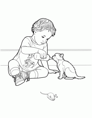 Opis Kolorowanki: Dziecko i Kotek Przedstawiona kolorowanka ukazuje uroczą scenę...