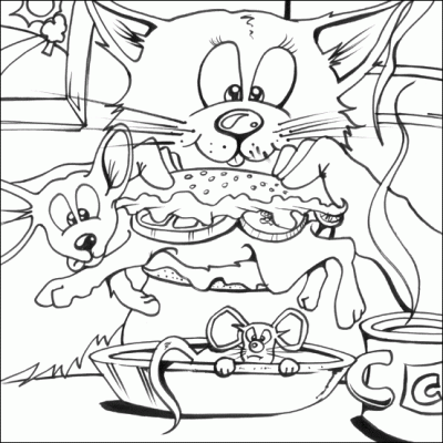 Kolorowanka do Druku: Sympatyczny Kot i Wesoły Pies w Kuchni