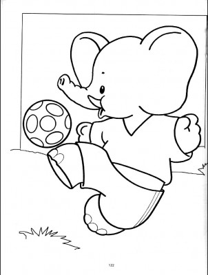 Opis kolorowanki ze słoniem grającym w piłkę Przedstawiona kolorowanka do druku